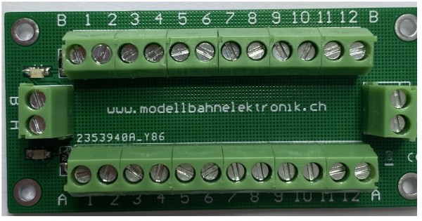 Auf der Platine sind 2 Anschlüsse (A und B) für die Einspeisung bzw. optonalen Weiterleitung und 2x12 Anschlüsse für den Spannungsausgang. Alle mit A" gekennzeichneten Klemmpunkte sind genau wie alle Punkte mit "B" durchverbunden.