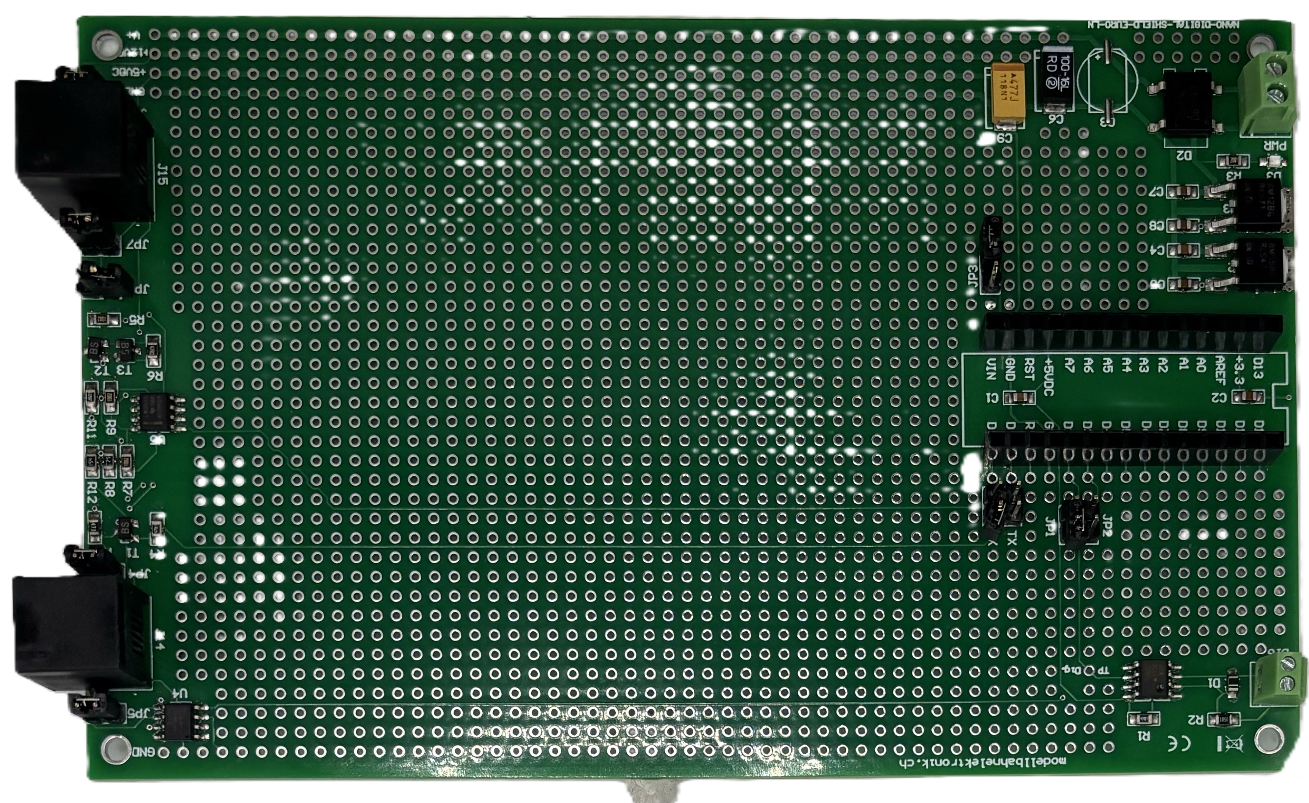 Wichtige Bausteine wie ein Optokoppler zu galvanischen Trennung von "Digitalstrom", einem Loconet© Sende/Empfangs Interface (Master & Slave) und dem Arduino Nano Steckplatz sowie eine einfache Stromversorgung sind bereits auf der Shield Platine vorgesehen. Ein grosses Lochrasterfeld im industriellen 100mil (2.54mm) Raster bietet einen grossen Freiraum für "eigene" Zusatzelektronik.