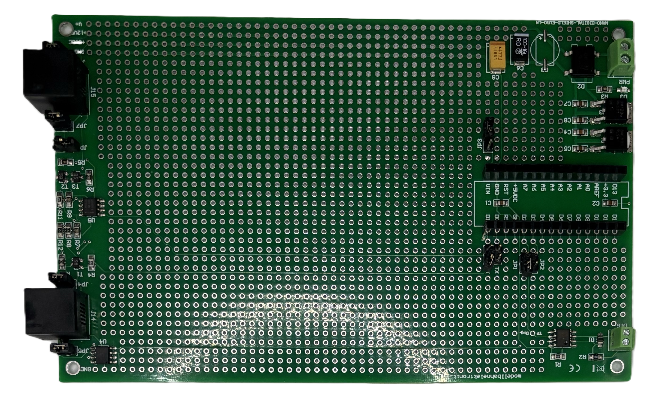 Das Digital-Development-Shield im Europakaten Format (100x150mm) auf Basis eines Arduino Nano ist ein einfacher Start in Ihr neues Projekt und eignet sich optimal für Evaluierungszwecke. Der Arduino Nano Digital Shield im Europa Karten Format unterstützt das "Rapid Prototyping" mit einem grossen Lochrasterfeld für die Realisierung eines anwenderspezifischer Modellbahnelektronik.